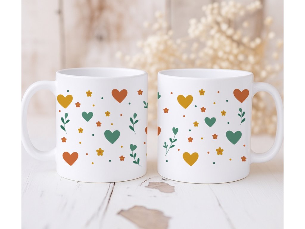 Hrneček plný radosti - veselý motiv srdíček, drobných kytiček a lístků v teplých barvách. Ideální jako milý dárek, který rozveselí každý den.