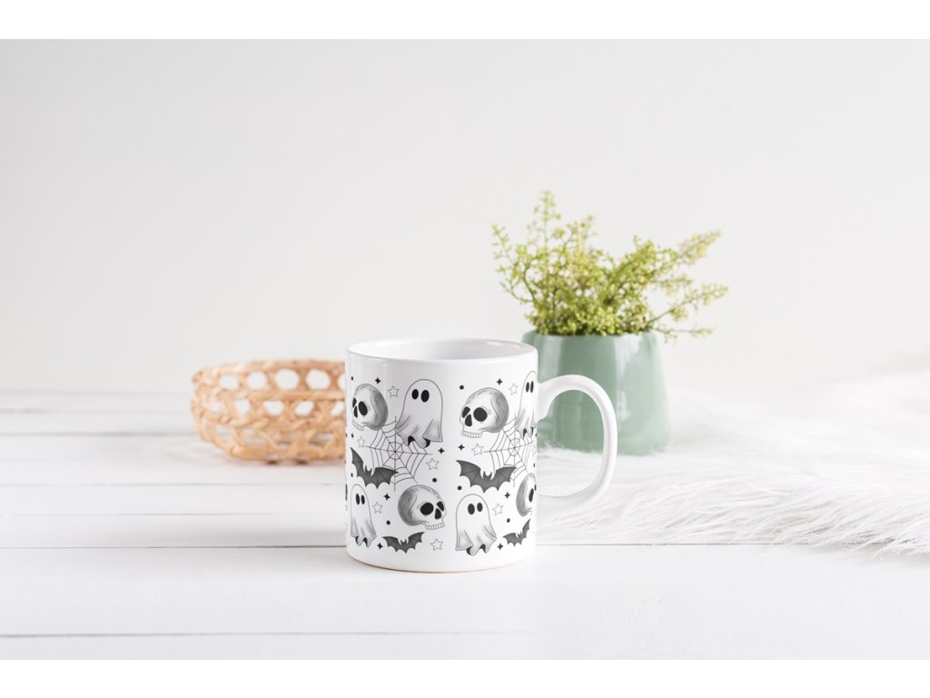 Černobílý hrnek vnáší do každého doušku nádech strašidelné Halloween atmosféry. Lebky, netopýři, pavučiny a duchové vytvářejí hravě děsivý motiv, který zaujme každého milovníka podzimních hororových radovánek.