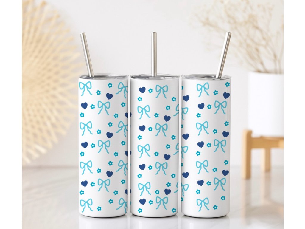 Termo kelímek zdobí modré mašličky, srdíčka a kytičky, která působí elegantně a jemně. Skvělý doplněk pro milovníky decentních motivů.