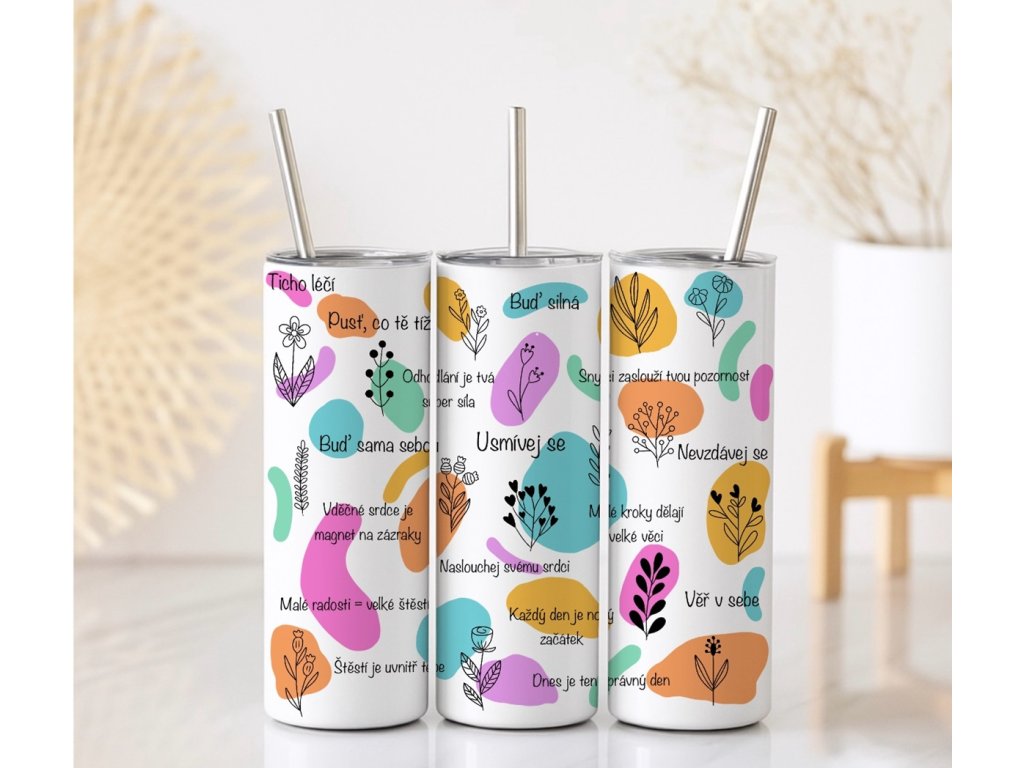 Design pozitivní myšlení je oslavou vnitřní síly, sebevědomí a klidu. Kombinuje jemné květinové prvky s veselými barvami a povzbudivými slovy, které ti zvednou náladu i v náročných dnech. Ideální termo kelímek pro všechny, kteří chtějí nosit kousek motivace vždy s sebou - doma, v práci nebo na cestách. Každý doušek ti připomene, že i malá změna může mít velký význam.